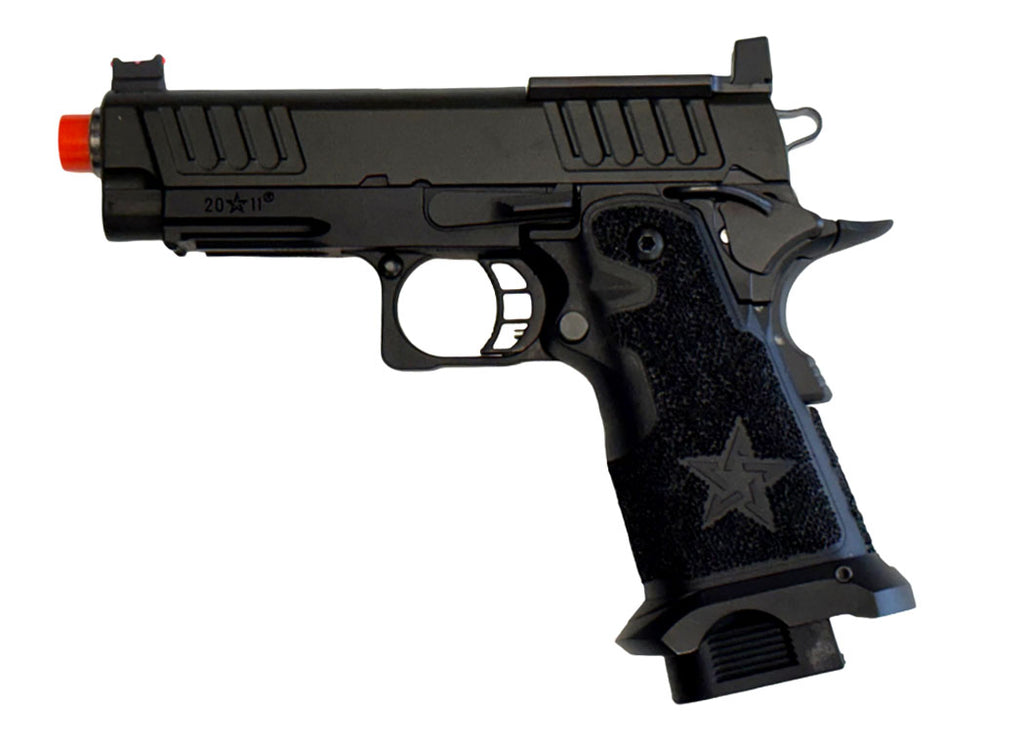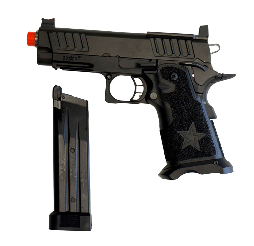 The Staccato C2 has quickly redefined what's possible with a compact carry gun. The C2 is finely crafted with wide serrations at the front and rear of the slide providing superior grip while racking it back, reduced recoil and improved cycling speed. The slide is optics-ready and comes with an RMR pattern plate for the installation of your favorite reflex dot sight. Additionally, the slide comes equipped with a fiber optic front sight and a tall rear sight that allows continued functionality when a reflex dot sight is installed. The C2 metal frame is robust and nicely weighted for a more realistic look and feel and comes with an under barrel accessory rail for your favorite lights or lasers. Preinstalled is a hand-stippled polymer grip which provides a comfortable and secure hold. Other features include a skeletonized trigger and textured trigger guard continuing to provide more stability while firing. The icing on this cake is the authentic licensed logos, patterns and roll marks of Staccato.